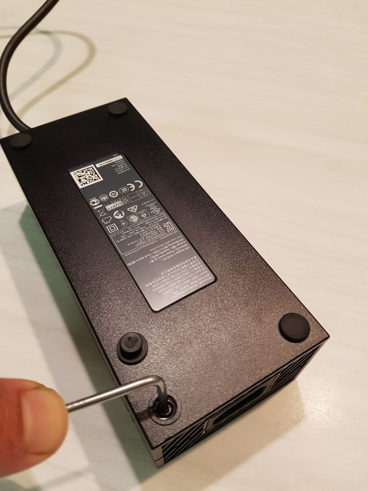 Opening the power brick requires a tamperproof torx T-10 driver. It has a hole in the centre of the bit as you can see from the photo below
