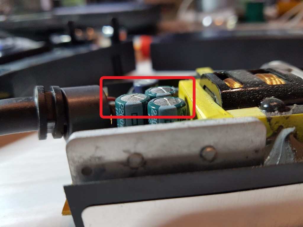 Looking inside the power supply, I felt good seeing something bad, coz that meant it should be an easy fix. There were a few bulging electrolytic capacitors. You can tell from the domed tops in the picture below.