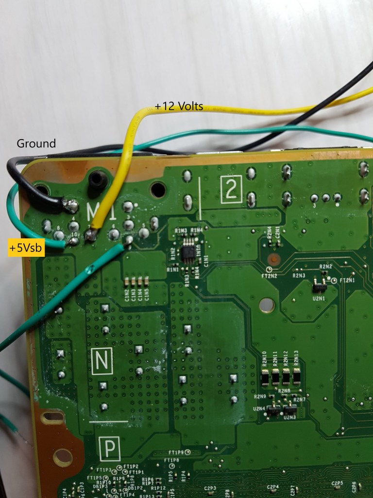 We needed to hook up the +12V, +5Vstandby and ground from the power supply to the Xbox One motherboard as shown below. This is the underside of the motherboard in the cell M1. The PC power supply will need to be turned on by connecting pin 16, the green wire, to ground, black wire in pin 15, on the ATX connector of the power supply.